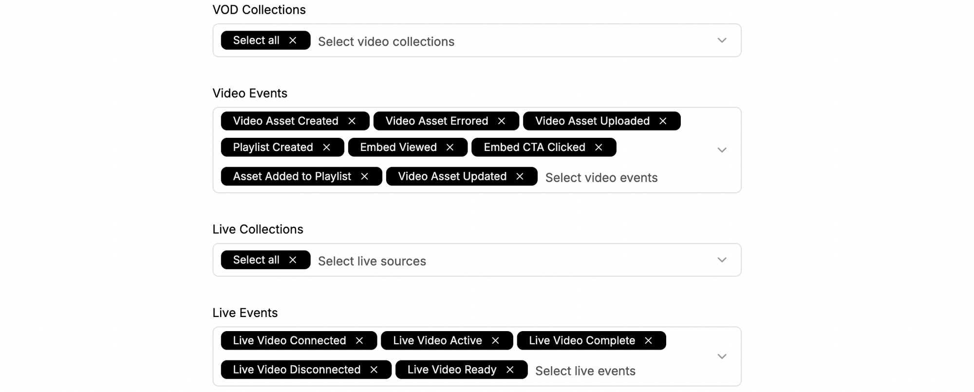 Receive real-time notifications for engagement and transactional events, such as video playback, video uploads, CTA clicks, and more. Build custom integrations, trigger automated workflows, or update analytics systems with reliable delivery and retry logic.