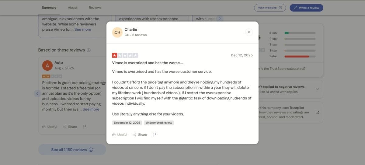 On Trustpilot, one business user describes Vimeo as “overpriced” with “the worst customer service,” saying they could not afford the renewed plan and felt the company was “holding my hundreds of videos at ransom” because access to content depended on paying the new subscription.